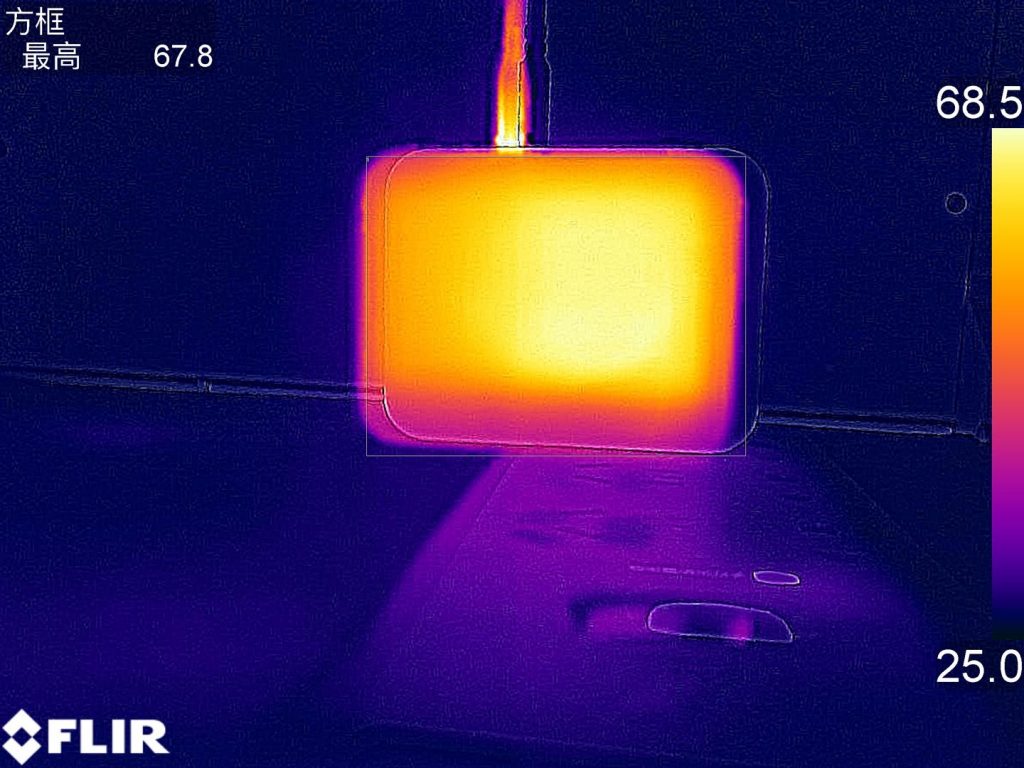 再来看另一面的温度,最高温度为67.8℃,温度提高了42.8℃。