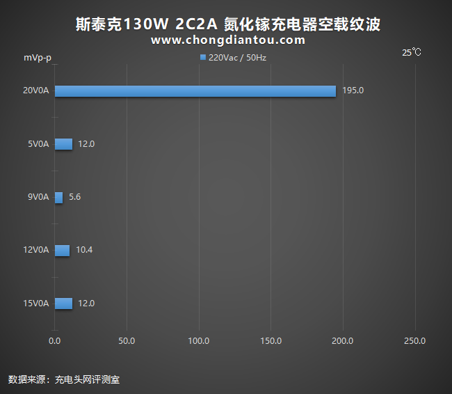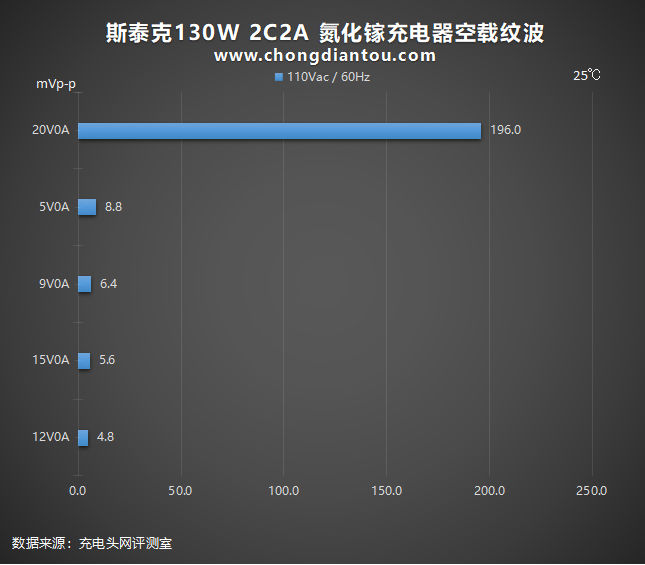 国家标准中充电器纹波要求是不高于200mVp-p,在110V 60Hz、240V 50Hz输入电压下,斯泰克130W 2C2A 氮化镓充电器所有输出功率纹波峰峰值虽然均低于200mVp-p这个标准,但在20V空载时接近200mVp-p。