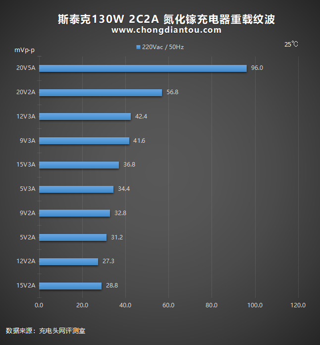 重载情况下:十个档位输出时纹波峰峰值从28.8mVp-p到96mVp-p不等。