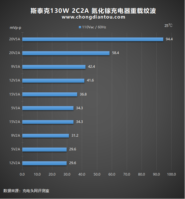 重载情况下:十个档位输出时纹波峰峰值从29.6mVp-p到94.4mVp-p不等。