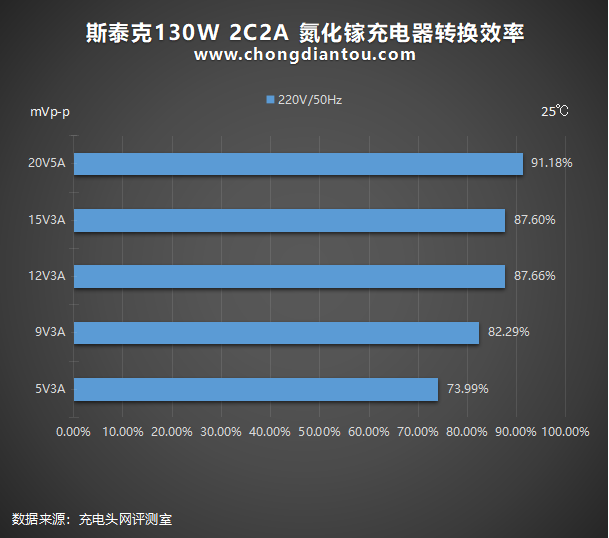 充电器本质上是一种转换设备,过程中会有损耗,以热量的形式散发出来。转换效率指的是充电器输出功率和输入功率的比值,也就是对电能的利用效率,转换效率越高越省电。斯泰克130W 2C2A 氮化镓充电器在220V 50Hz和110V 60Hz交流输入的各个电压档位下共测试出十个数据,从73.81%到91.18%不等。
