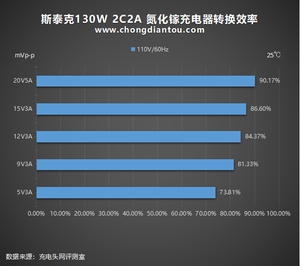 在110V 60Hz交流输入的情况下进行的转换效率测试,通过计算,可得充电器的转换效率从73.81%到90.17%不等。