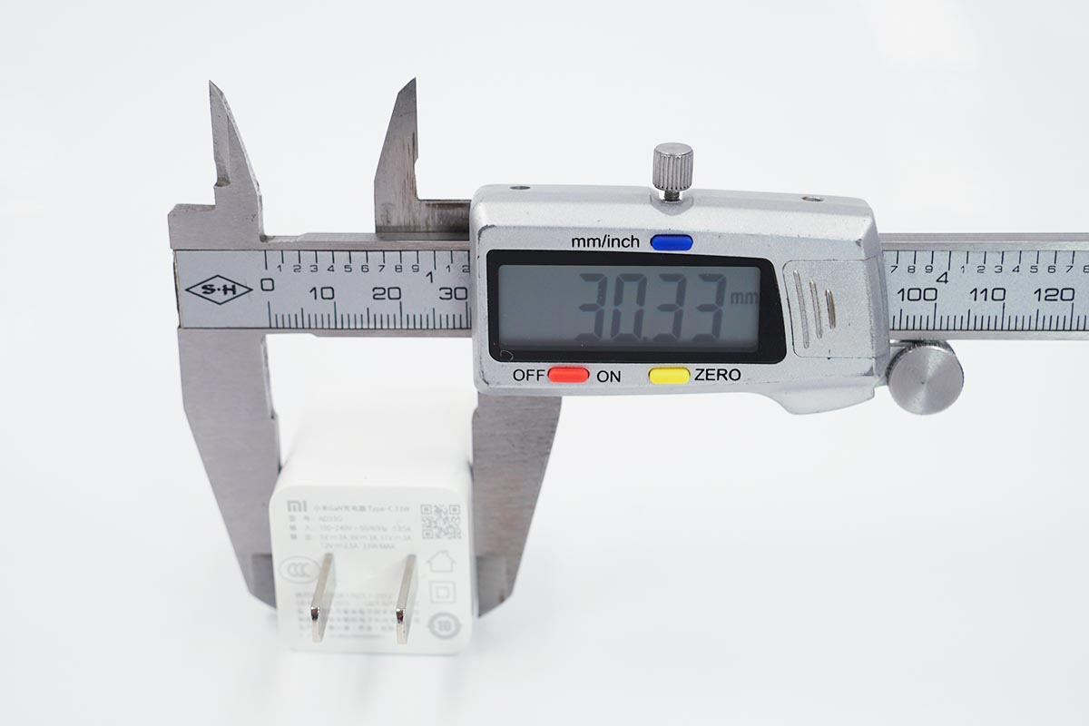 使用卡尺实测充电器的长度约为30.33mm。