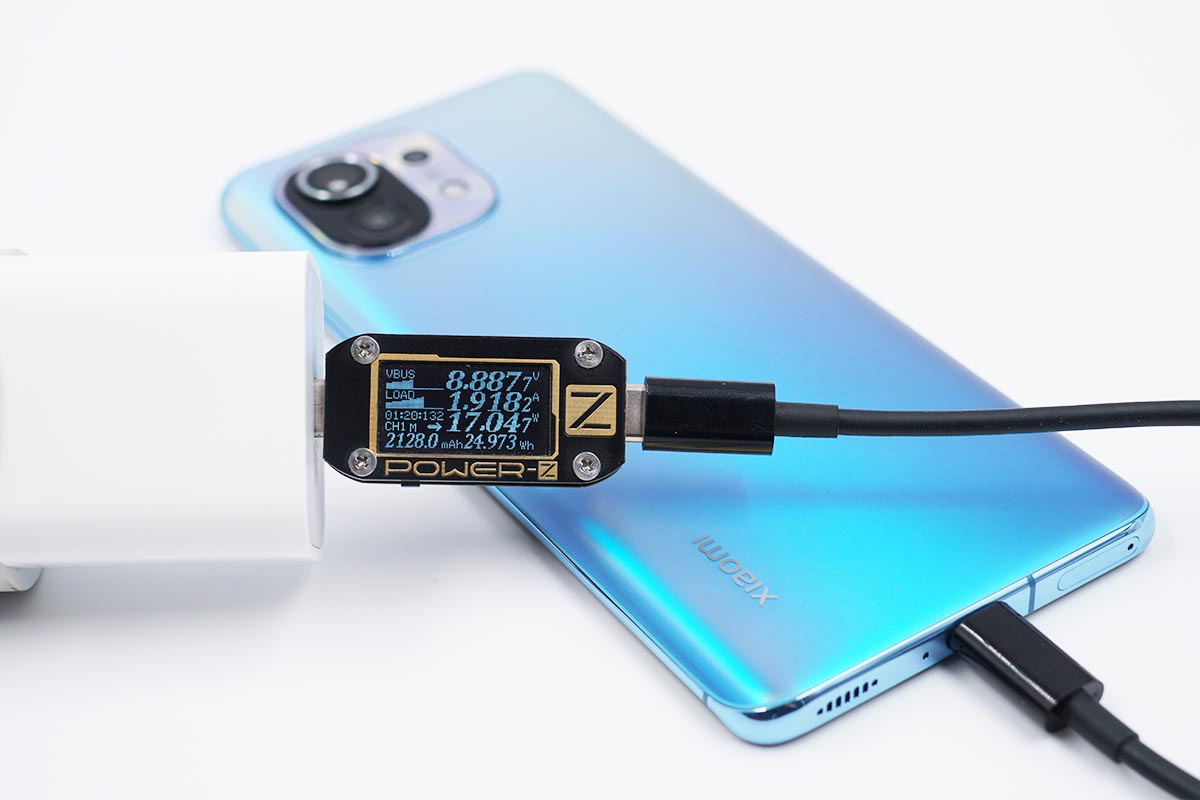 使用苹果20W PD充电器为小米11充电,功率为8.88V 1.91A 17.04W。