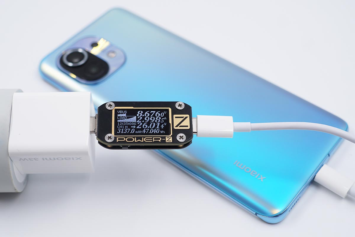 使用充电器为小米11充电,功率为8.67V 2.99A 26.01W,对小米11的快充支持情况明显更好一些。