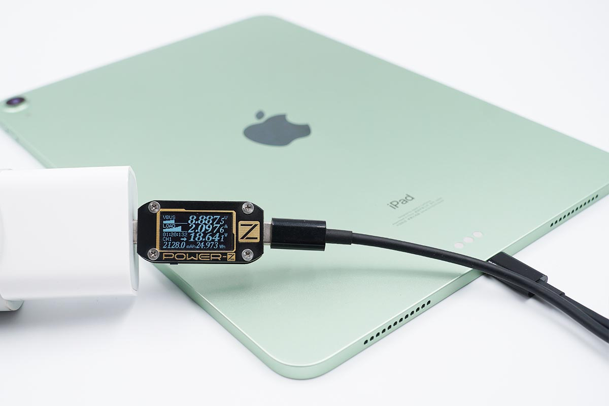 使用苹果20W PD充电器为iPad Air 4充电,功率为8.88V 2.09A 18.64W。