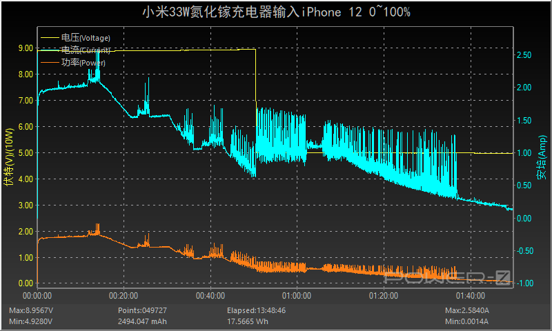 使用小米33W氮化镓充电器为iPhone 12充电,开始时便握手PD快充,约12分前功率、电流和电压平台一直处于稳定的输入状态,功率在18W左右。随后功率和电流开始出现阶梯式的下降状态,50分钟后电压从9V降至5V输入,1小时11分后功率和电流逐渐下降直至充电结束,全程耗时约1小时48分,最高功率为8.86V 2.56A 22.69W。