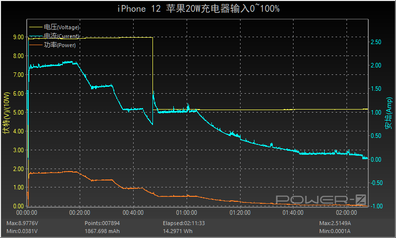 使用苹果20W充电器为iPhone 12充电,约16分前三大数据平台相对稳定,随后电流和功率呈阶梯式的下降状态,48分时电压降至5V输入,持续了约14分后功率和电流逐渐下降直至充电结束,全程耗时约1小时41分,功率最高为8.90V 2.06A 18.41W。