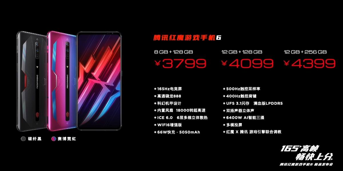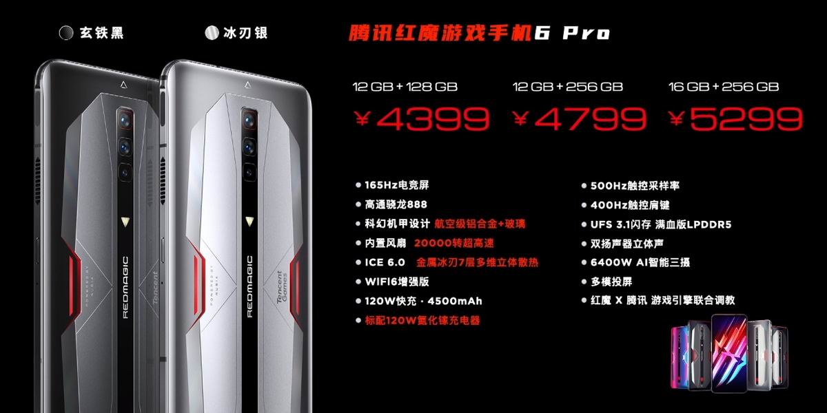 腾讯红魔游戏手机 6 Pro配置简介:165Hz电竞屏500Hz单指/360Hz多指屏幕触控采样率,400Hz肩键,骁龙888 + UFS3.1 + LPDDR5,航空铝+玻璃壳体设计7层多维立体散热,20000rpm涡轮风扇,4500mAh双电芯120W快充,标配120W氮化镓PD充电器。玄铁黑、冰刃银两个配色,三种存储容量可选,12GB+128GB售价为4399元,12GB+256GB售价为4799元,16GB+256GB售价为5299元。