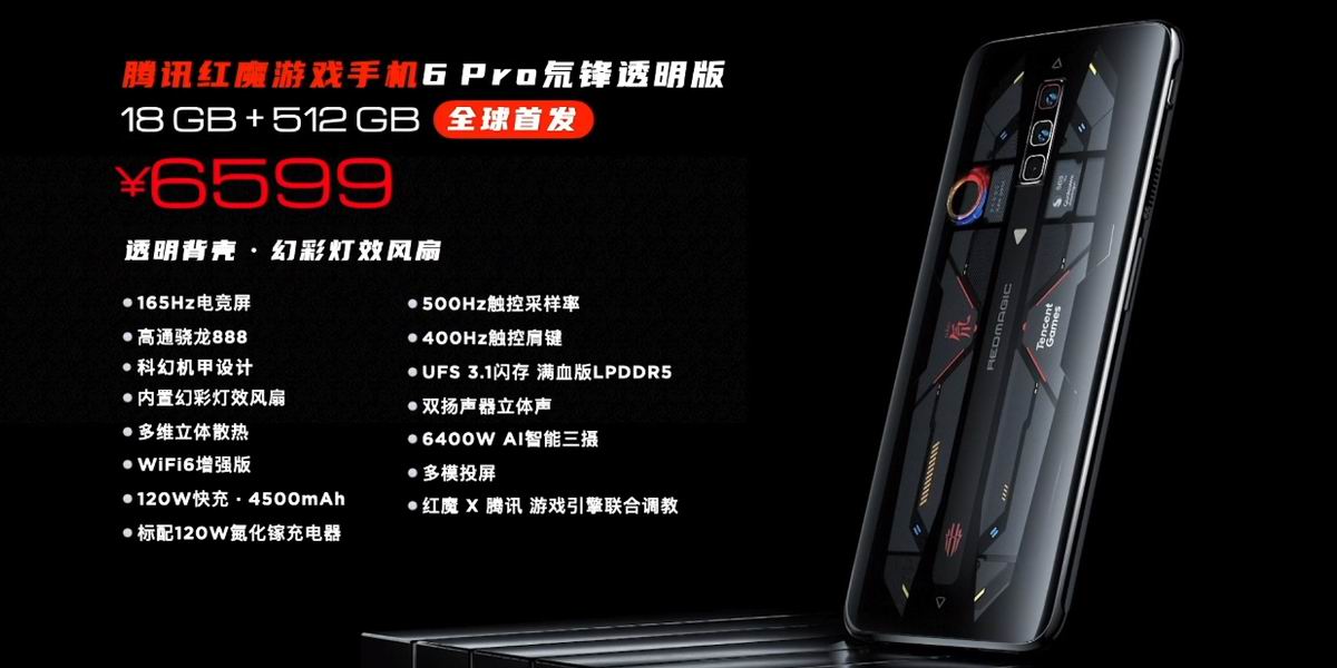 腾讯红魔游戏手机 6 Pro氘锋透明板配置简介:165Hz电竞屏500Hz触控采样率400Hz肩键,骁龙888 + UFS3.1 + LPDDR5,科幻机甲设计透明玻璃,多维立体散热,20000rpm幻彩灯效涡轮风扇,4500mAh双电芯120W快充,标配120W氮化镓PD充电器。玄铁黑、冰刃银两个配色,三种存储容量可选,12GB+128GB售价为4399元,12GB+256GB售价为4799元,16GB+256GB售价为5299元。