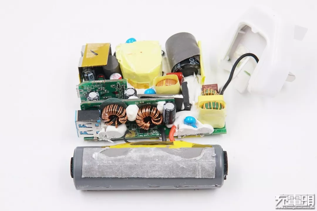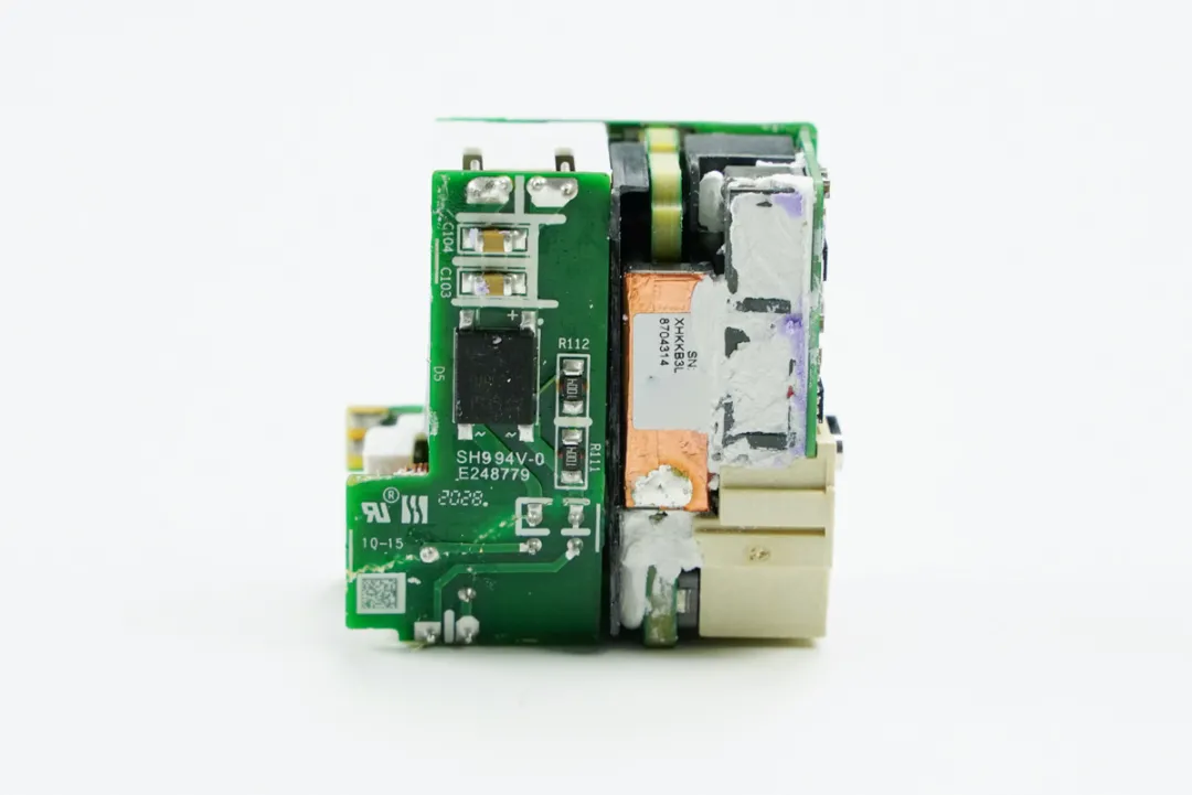 这款产品的内部设计并不算十分复杂,主要由AC转换器和氮化镓三口快充充电器两部分组成。充电器模块采用开关电源加三路DC-DC独立降压输出架构,支持多个主流快充协议,方便外出携带,实用性强。