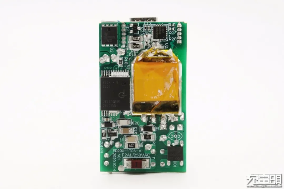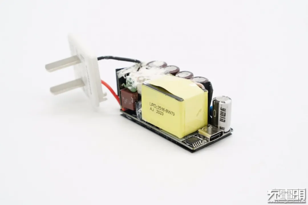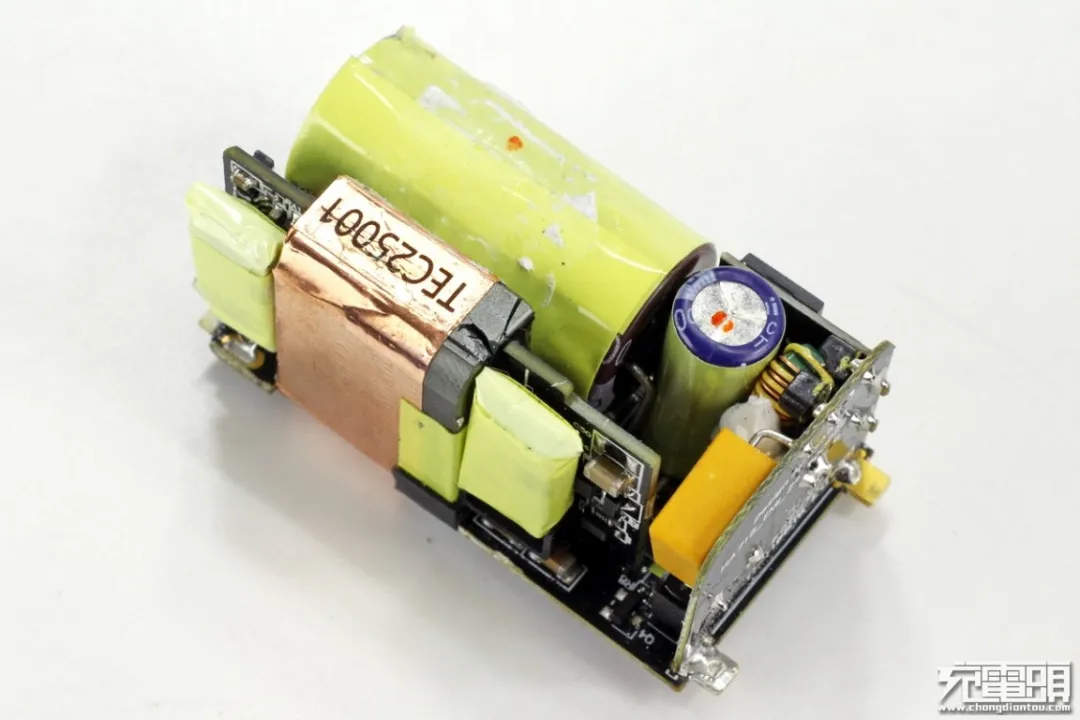 充电头网拆解了解到,这款产品内部采用了高性能、成本的ACF架构以及平面变压器,并且将柱状的输出滤波电容改为贴片电容替代。在结构设计方面,其所采用的平面变压器并不仅仅只是一块PCB板,上面还布局了比较复杂的电路,承载了同步整流的功能,这也是平面变压器的一次创新性应用。