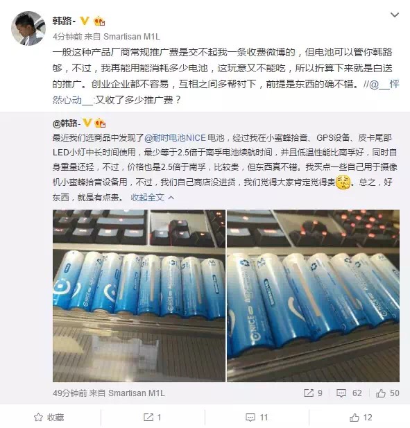韩路先生在微博中写到“耐时电池,经过我在小蜜蜂拾音、GPS设备、皮卡尾部LED小灯中长时间使用,最少等于2.5倍于南孚电池续航时间,并且低温性能比南孚好,同时自身重量还轻,不过,价格也是2.5倍于南孚,比较贵,但东西真不错”,夸赞了耐时电池容量大、重量轻的优点。