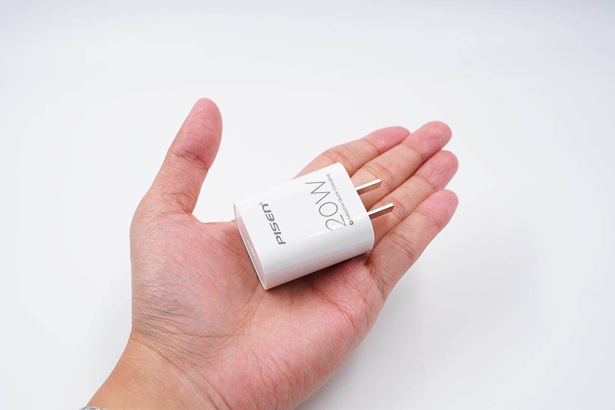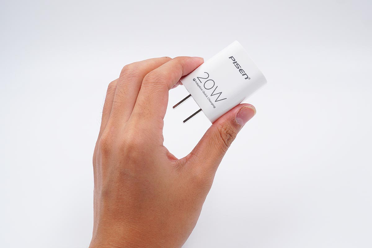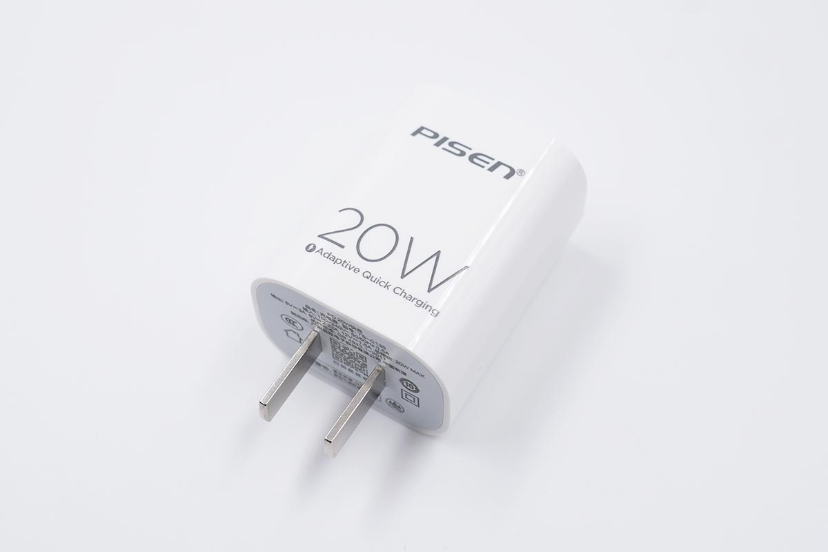 品胜20W充电器整体和苹果原装20W充电器造型差不多,白色的壳体上丝印了“PISEN”的品牌Logo以及20W的标识。
