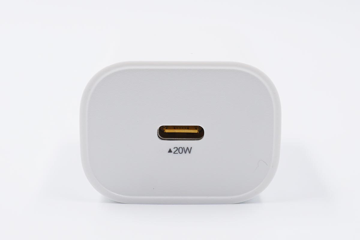 充电器采用单USB-C物理输出接口设计,且接口的位置在中间的位置,USB-C内部为黄色胶芯,下方的20W字样再一次的证明了产品的性能。
