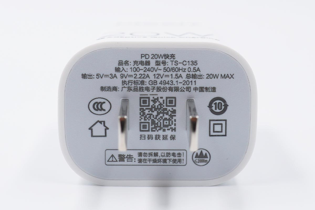 充电器的插脚为不可折叠的设计,同时在底部还丝印了产品的具体参数。