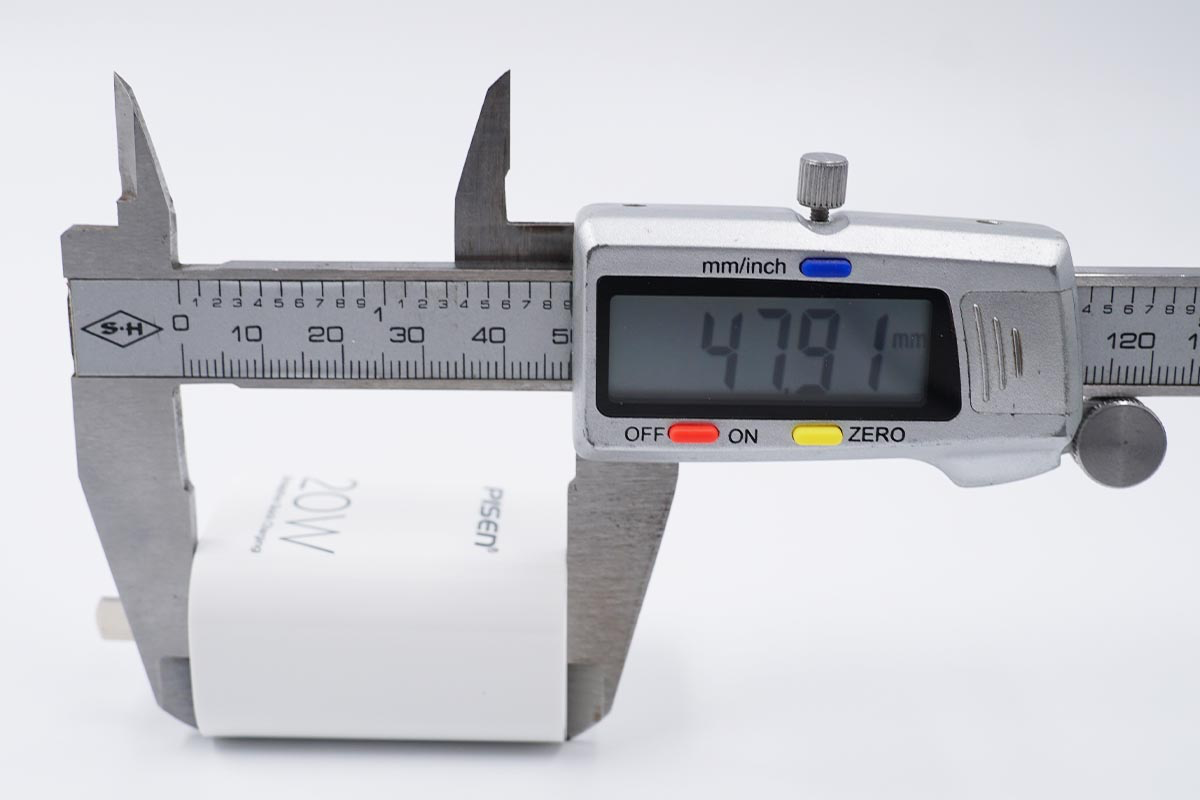 使用卡尺实测充电器不算插脚的长度约为47.91mm。