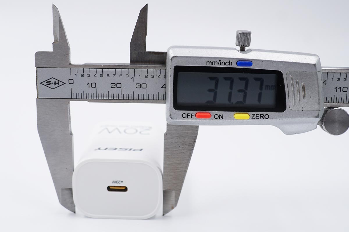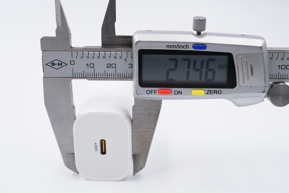 和苹果20W放在一起比较,相较于苹果20W充电器要更加细长一些。