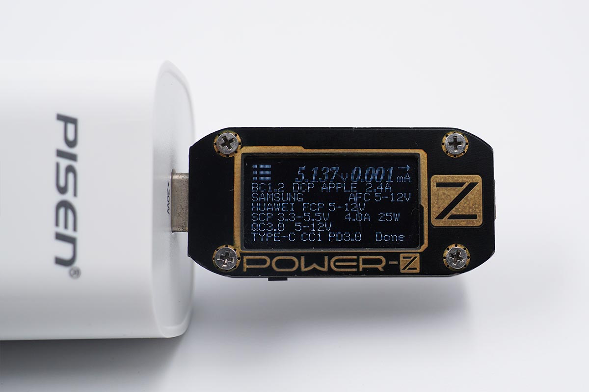 使用POWER-Z KM001C读取充电器的快充协议,实测支持Apple2.4A、QC2.0、QC3.0、AFC、FCP、SCP、PD快充协议。