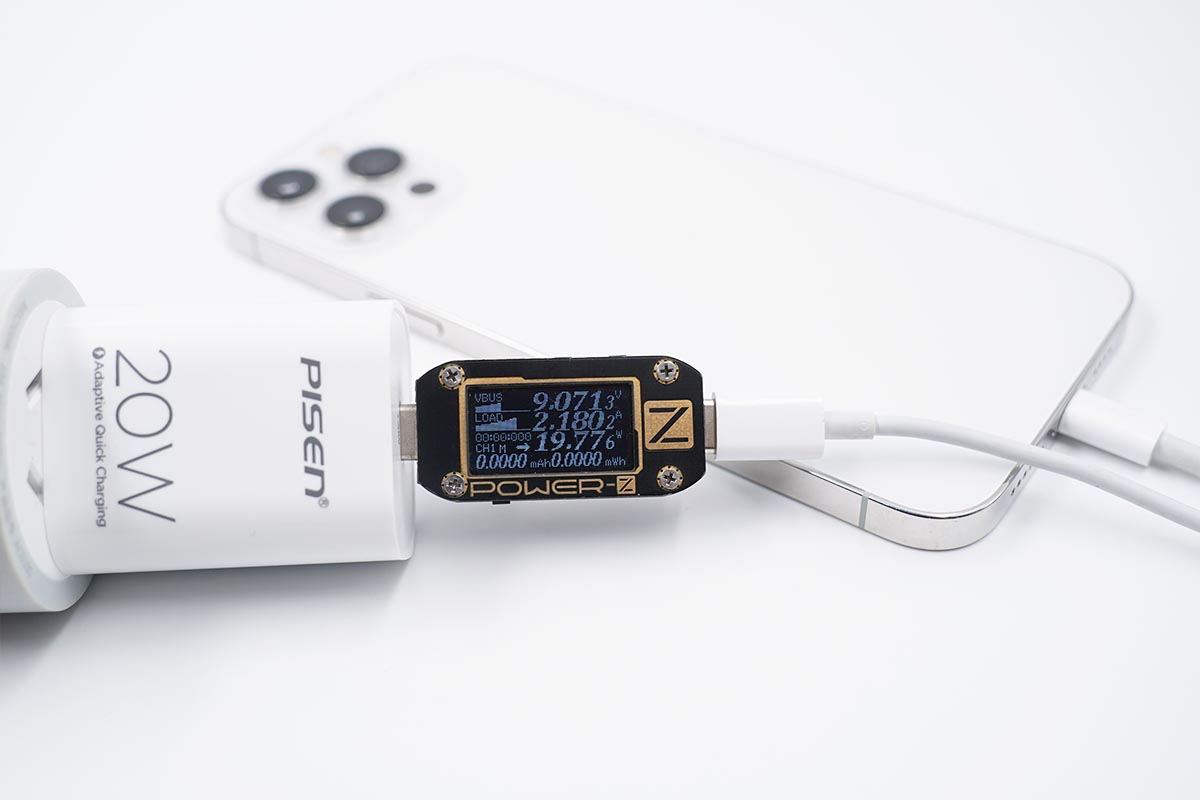 使用品胜20W PD充电器为iPhone 12 Pro Max充电,功率为9.07V 2.18A 19.77W,成功握手PD快充。