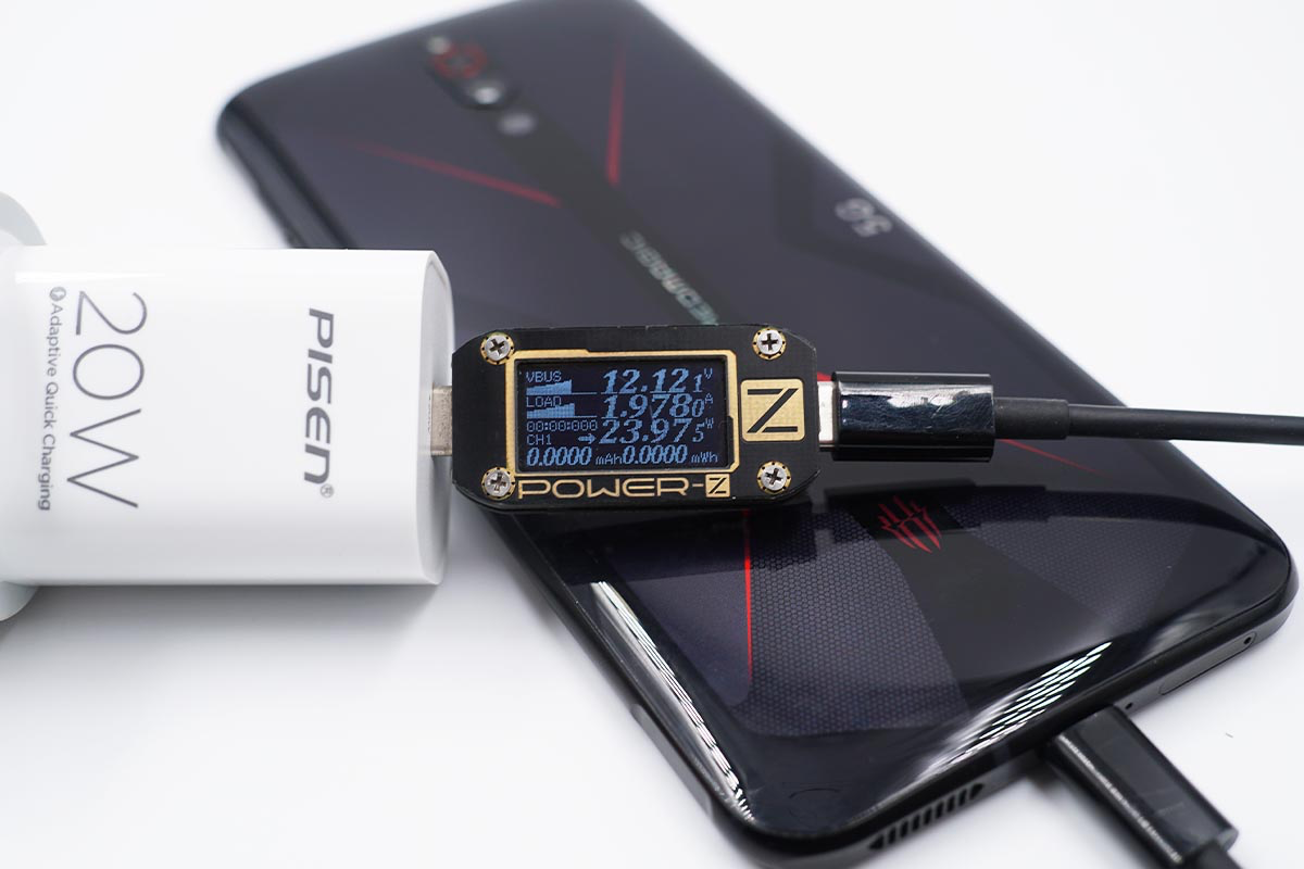 使用品胜20W PD充电器为努比亚红魔5G手机充电,功率为12.12V 1.97A 23.97W,功率已经超出了标称的最大值,看来充电器还是有一个功率盈余的。