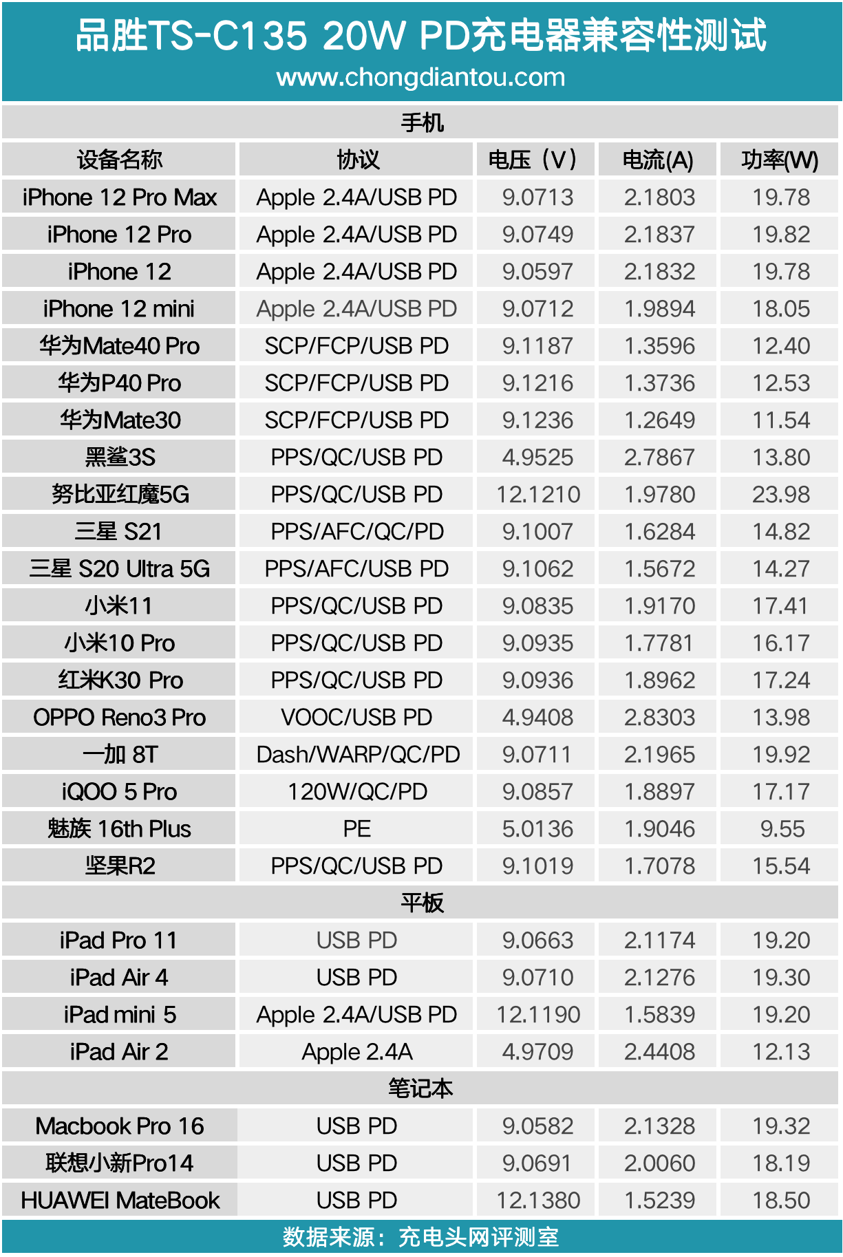 将所有测试数据汇总成表,对于大部分设备都可以触发相应的快充协议,只是在为黑鲨3S充电时功率为13.8W。
