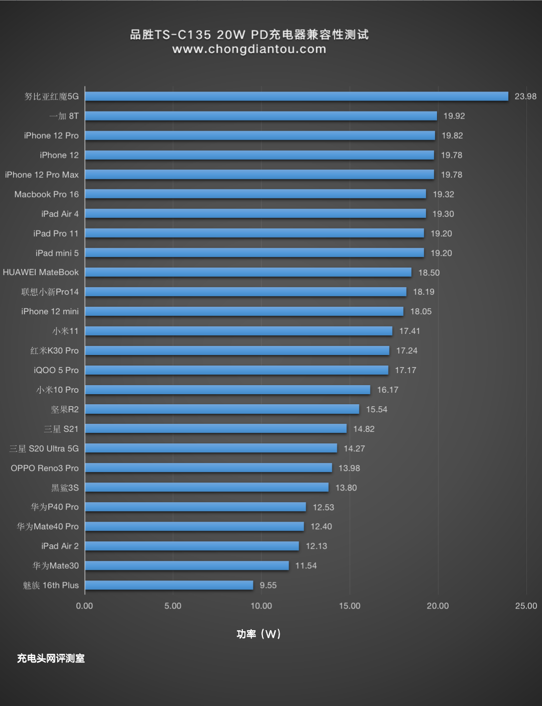 整个柱状图里努比亚红魔的充电功率最高,剩余其他设备的充电功率柱状图走向较为平缓,魅族16th Plus由于仅支持PE快充所以功率只有9.55W。