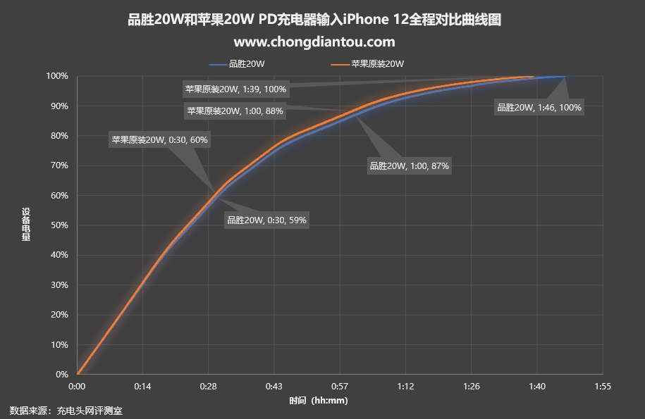 除此之外笔者还将苹果原装20W PD充电器充电全程的曲线图放在一起做了对比,可以看到两条曲线几乎重合,整体区别不大。
