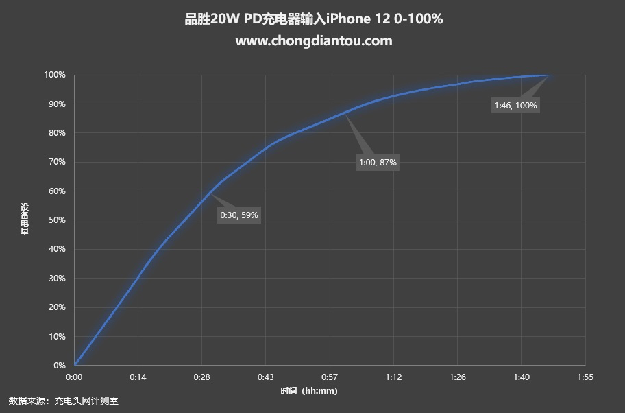 将整个充电过程绘制成曲线图,经实测,品胜20W PD充电器半小时为iPhone 12充入59%的电量,1小时充电87%,完全充满需要1小时46分。