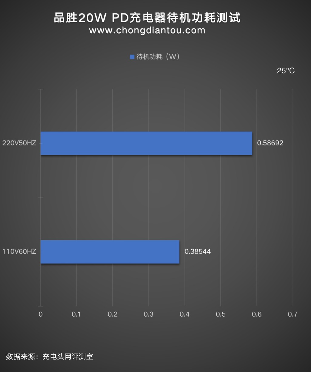 经过功率计测试,品胜20W充电器在220V 50Hz的空载功耗为0.067W,换算下来一年损耗的电能约为0.58KW·h,若市价电为0.6元/KW·h,则充电器一年的空载功耗约为0.34元左右。
