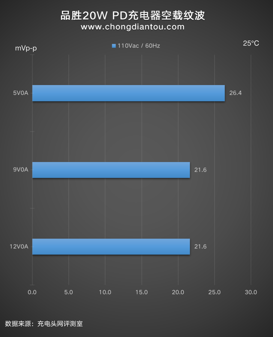 国家标准中充电器纹波要求是不高于200mVp-p,品胜20W充电器在110V 60Hz、240V 50Hz输入电压下,所有输出功率纹波峰峰值均低于200mVp-p这个标准,表现不错。