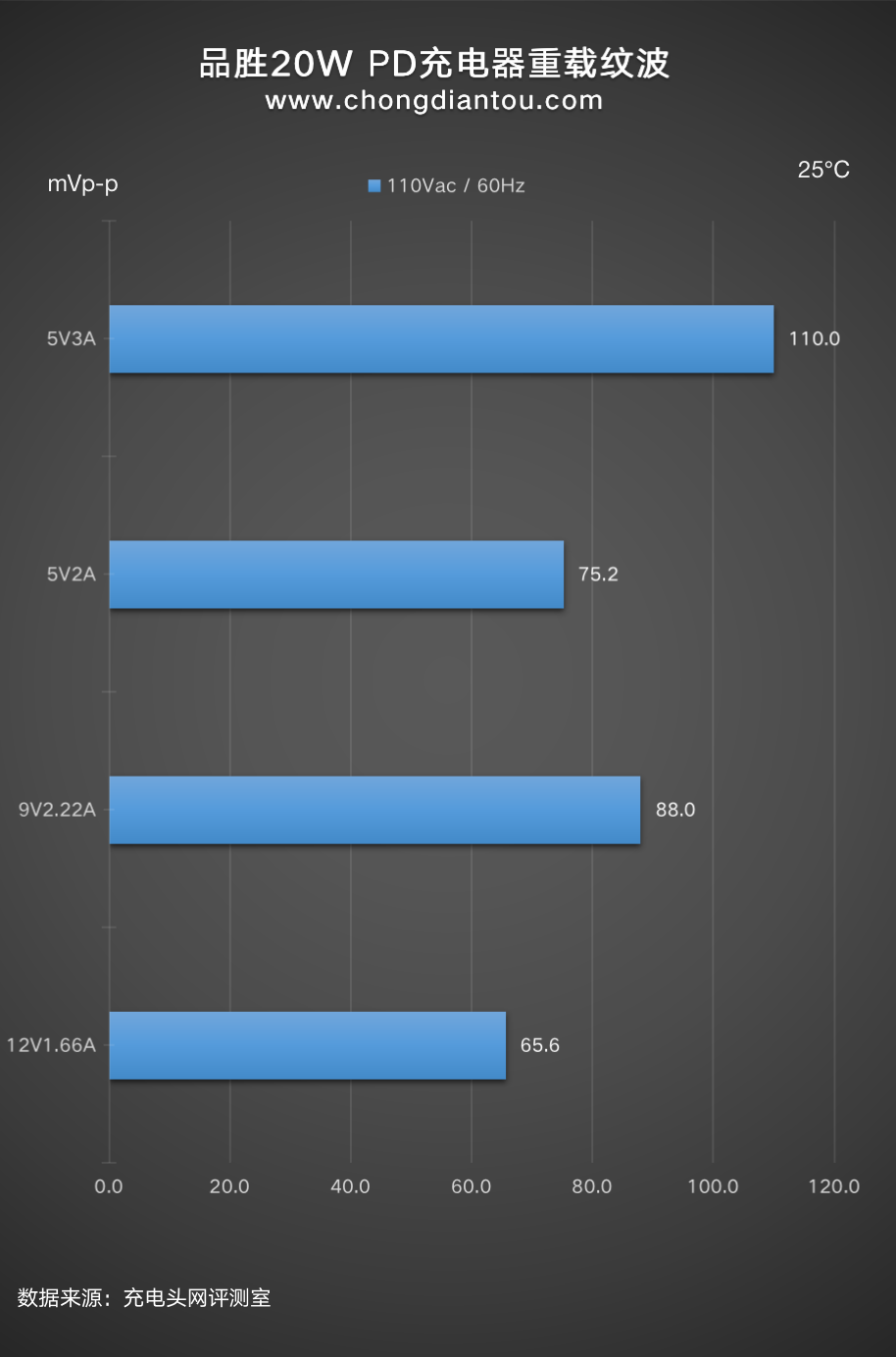 重载情况下:四个档位输出时纹波峰峰值从65.6mVp-p到110mVp-p不等。