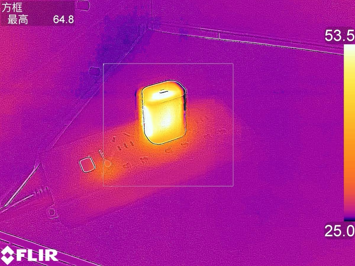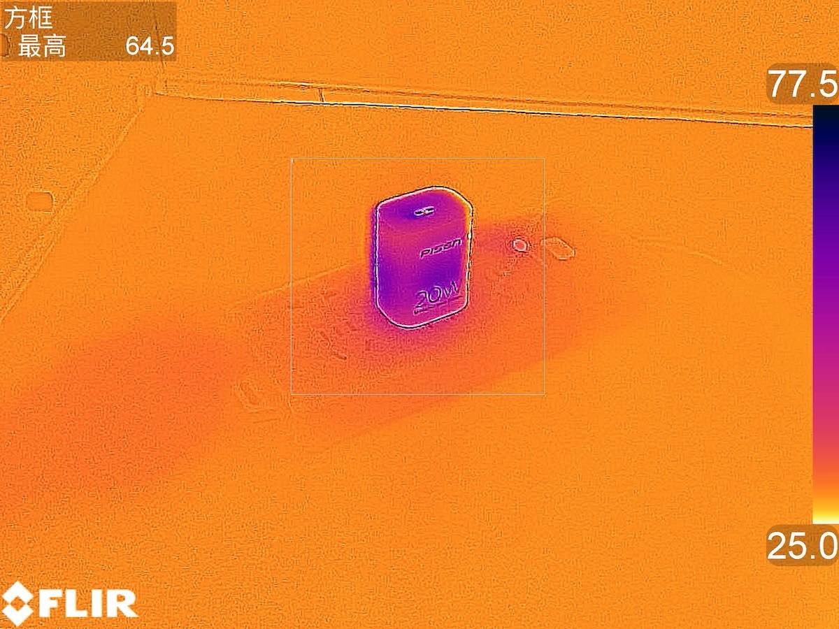 在以20W的功率持续输出1小时后充电器的最高温度为64.8℃。