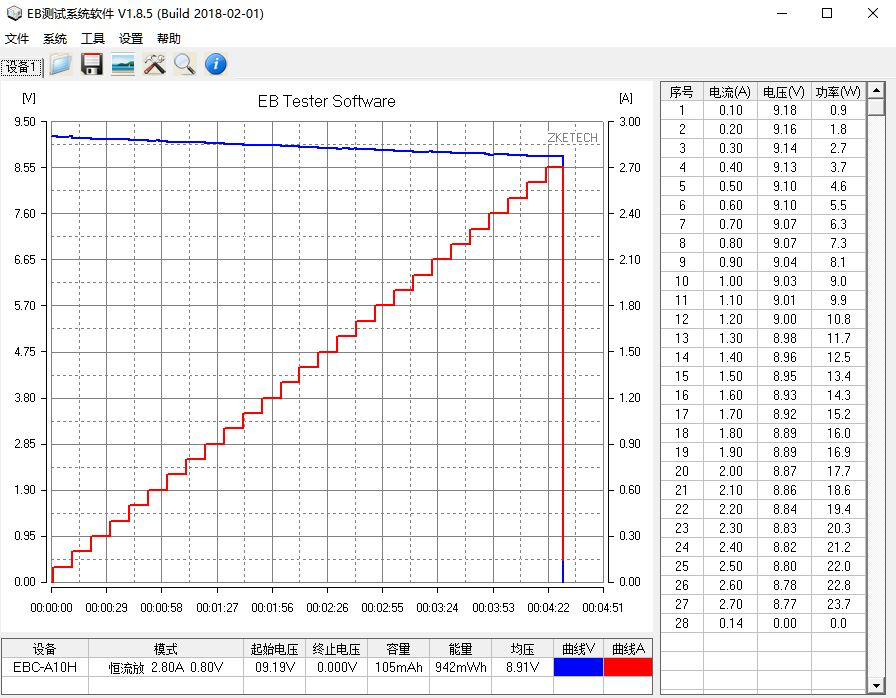 使用EB程控电子负载测试品胜20W PD充电器的最大输出功率,以0.1A为电流步进幅度,10秒为时间间隔,最终录得充电器9V档位的最大输出为8.77V 2.7A 23.7W。