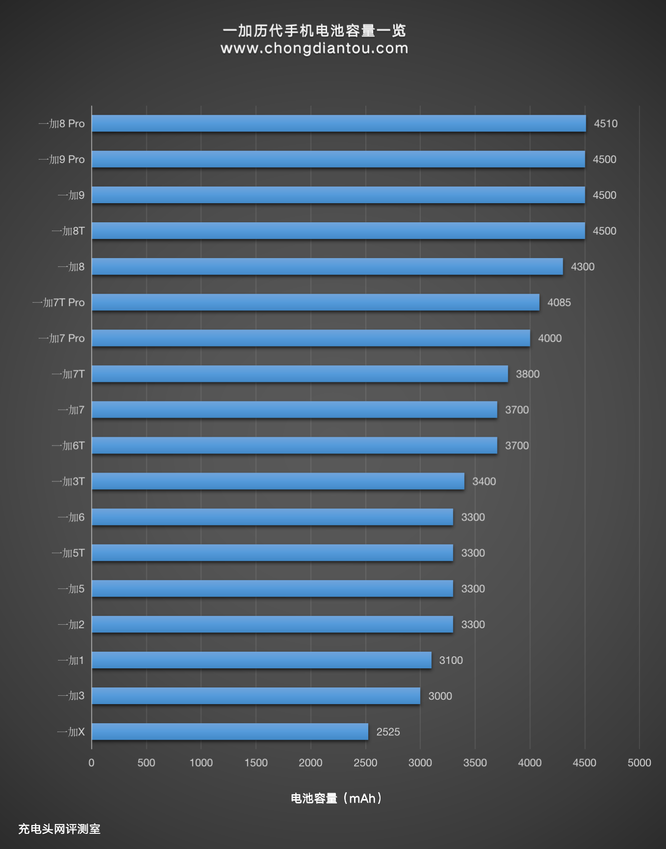 和充电功率不同的是,一加手机的电池容量变化却不是随着手机的更新而增加的,整体的柱状图走向较为平缓,互相之间差别不大,目前一加电池容量最大的机型为一加8 Pro,达到了4510mAh。