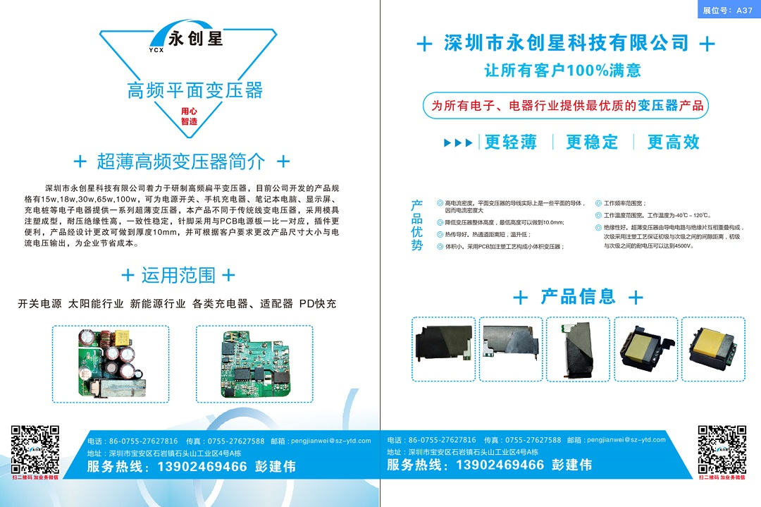 永创星是一家集研发,制造 ,销售为一体的专业生产平面变压器厂家,近期针对PD快充、氮化镓快充等高密度电源产品,全新的超薄平面变压器通过塑封工艺得到变压器的次级线圈组,与全集成PCB变压器相比少了次级绕组,成本更低,同时也解决了高频变压器的高度一致性,并且已经获得专利。12月18日展会现场也将有平面变压器案例展示。