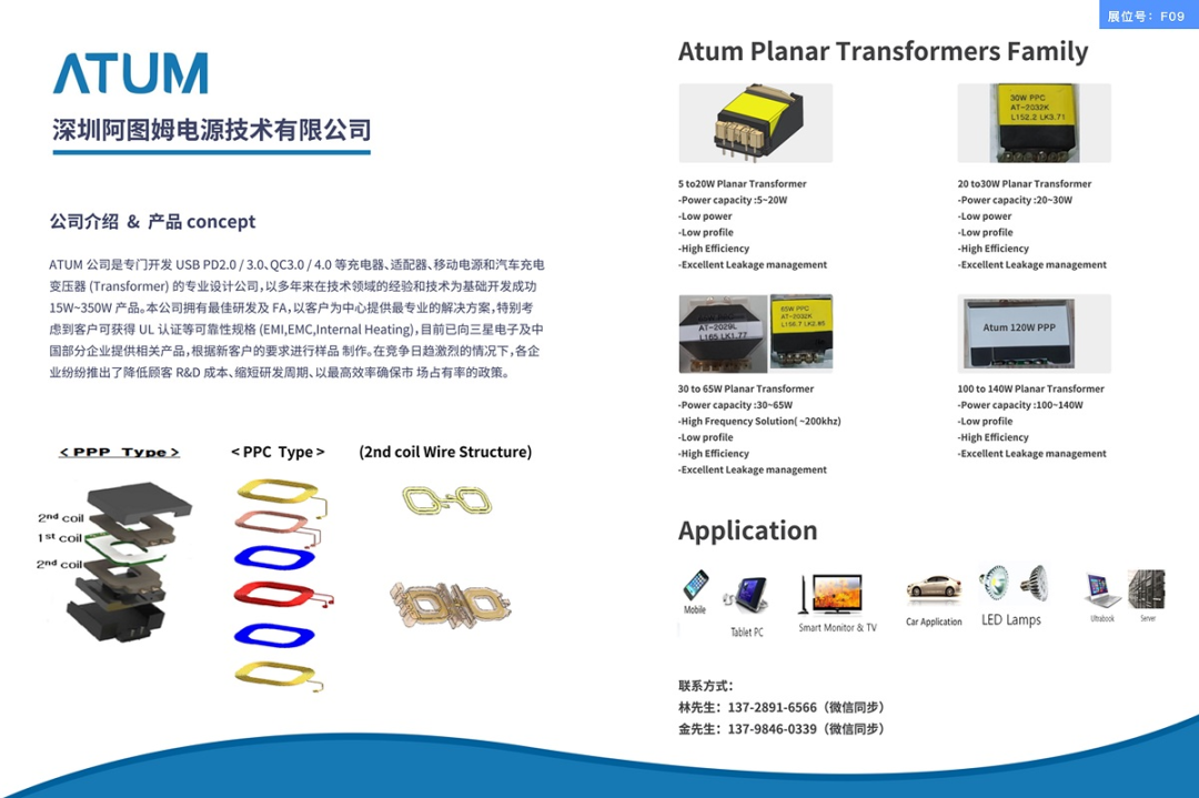 ATUM公司是专门开发USB PD2.0/3.0、QC3.0/4.0等充电器、适配器、移动电源和汽车充电变压器的专业设计公司,以多年来在技术领域的经验和技术为基础,开发成功15W~350W产品。