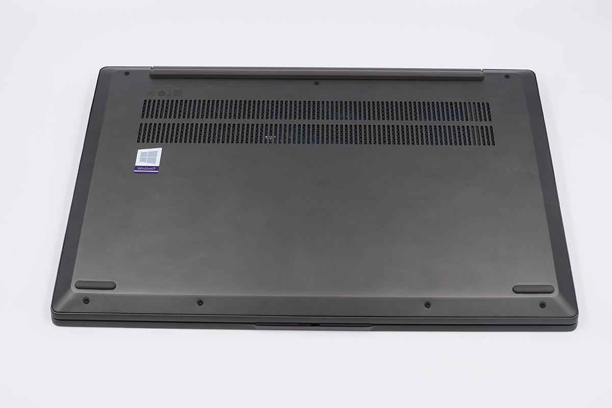 笔电的D面,上半部分为风扇散热区域,转折处留有增高垫有助于机身散热。
