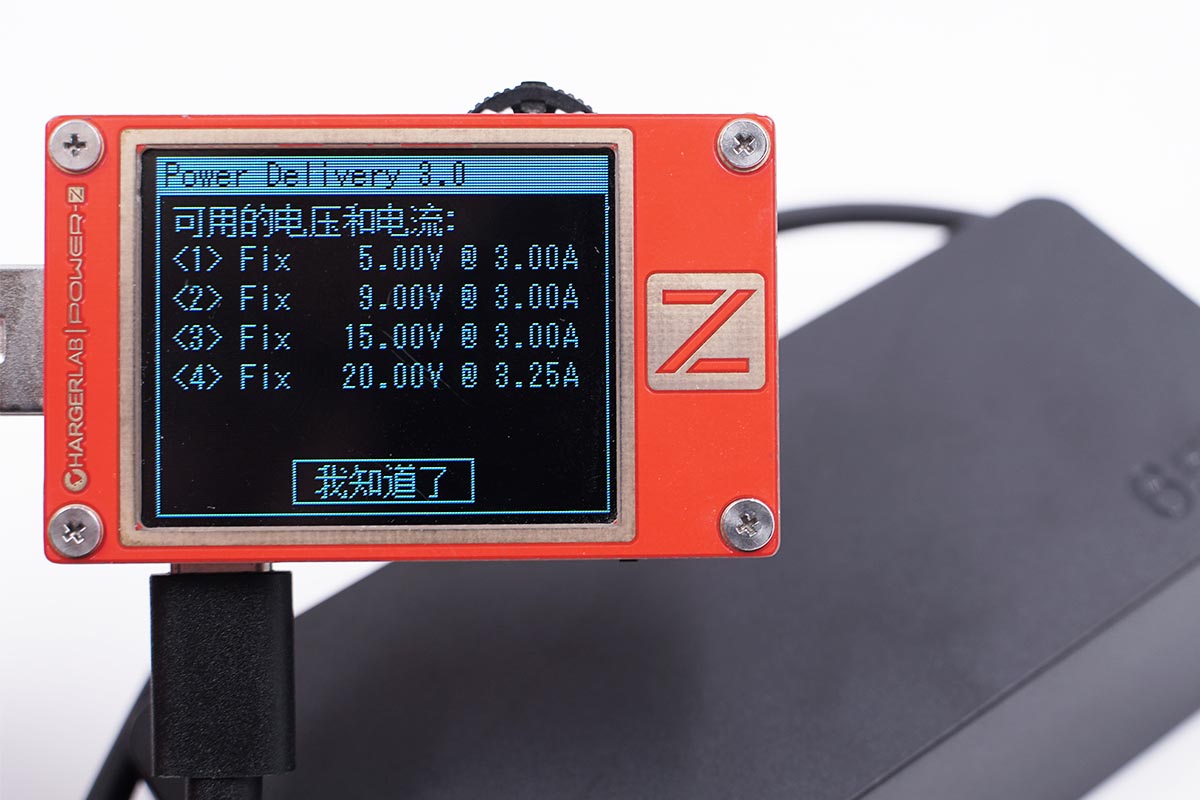 读取充电器的PDO报文,支持5V3A、9V3A、15V3A、20V3.25A四个固定电压档位,支持最高65W的充电功率,只是缺少了12V电压档。