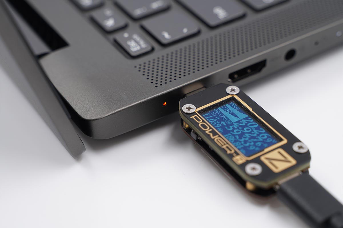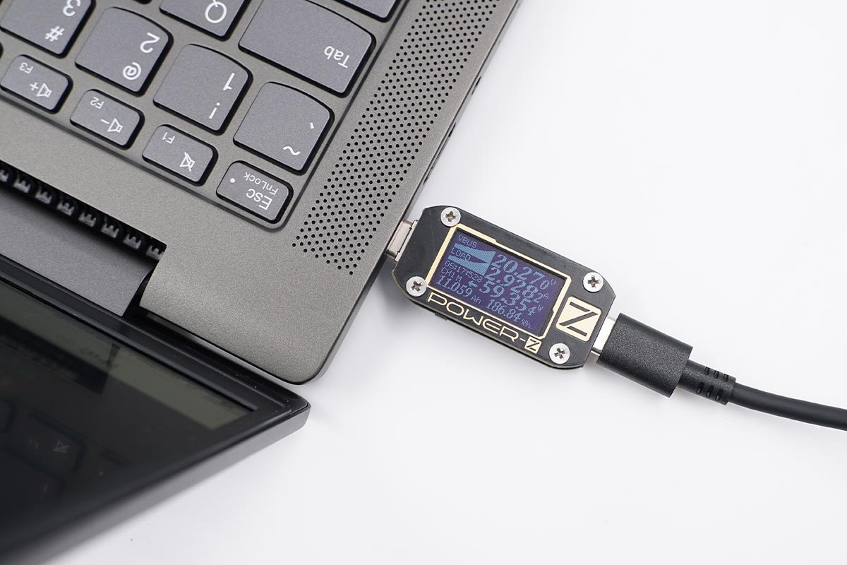 实测使用附带的原装65W充电器为笔电充电,功率为20.27V 2.92A 59.35W,成功握手PD快充。
