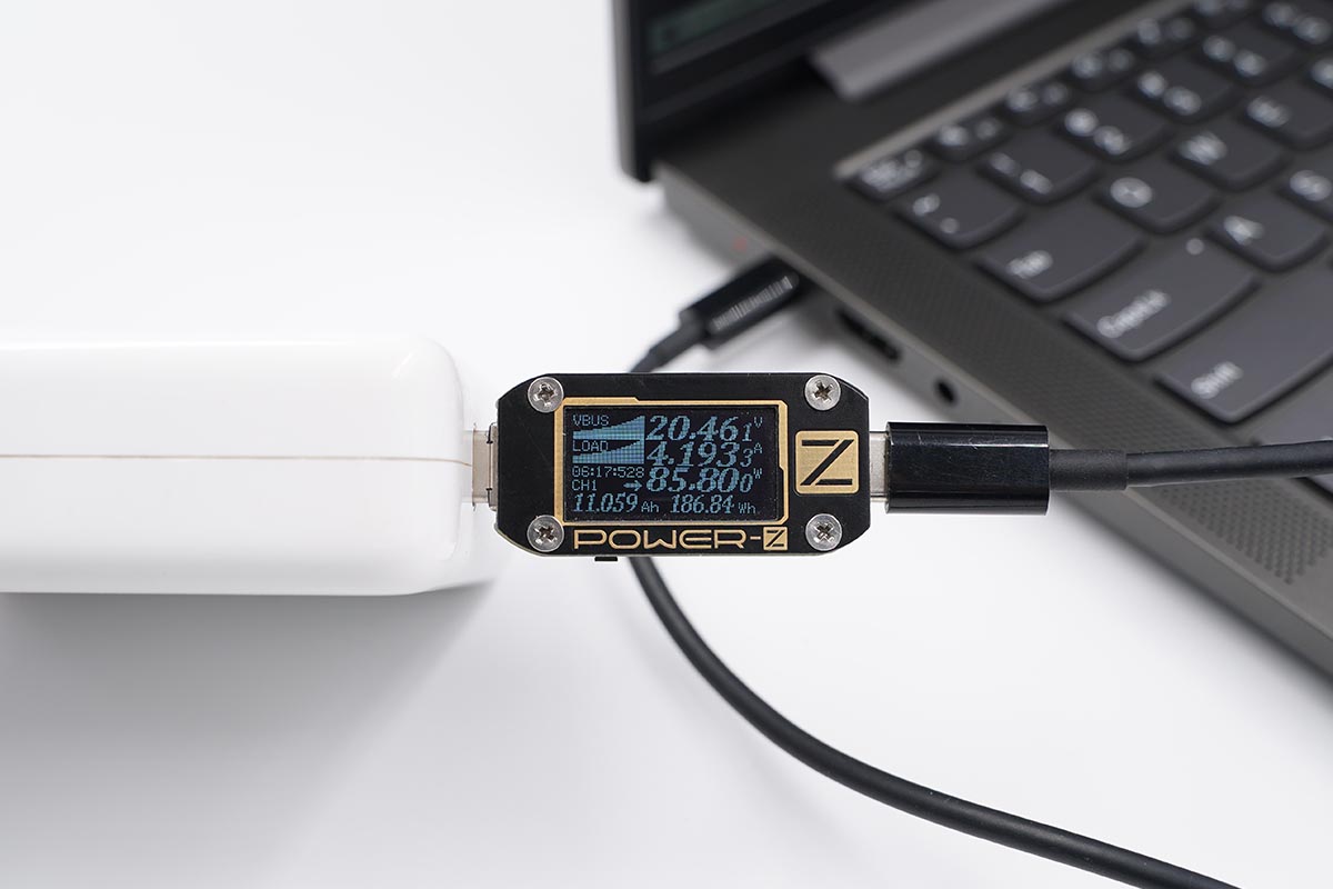 首先使用苹果96W PD充电器为笔电充电,实测功率可以达到20/46V 4.19A 85.80W,虽然标配的是65W的充电器,但笔电明显支持更高的快充功率。