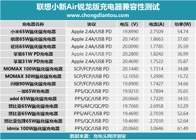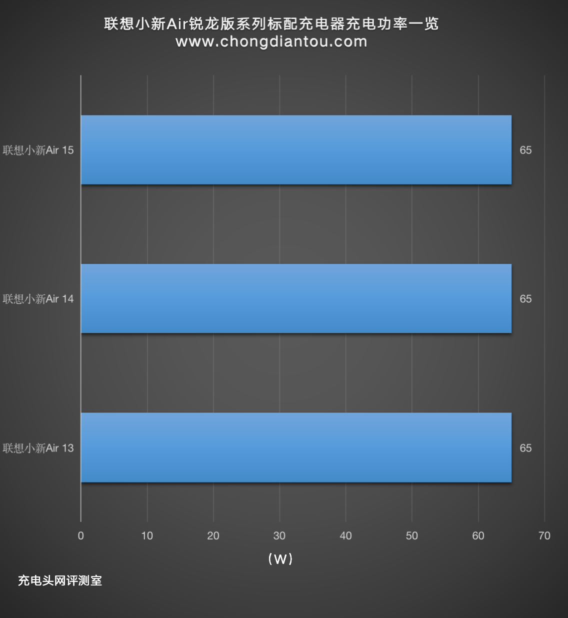 充电功率上由于笔电在待机状态下和运行状态下的功率不一致,所以这里仅统计了标配的充电器,可以发现,无论是哪个版本的小新Air,在标配充电器上却是一致的,均标配了65W PD充电器。