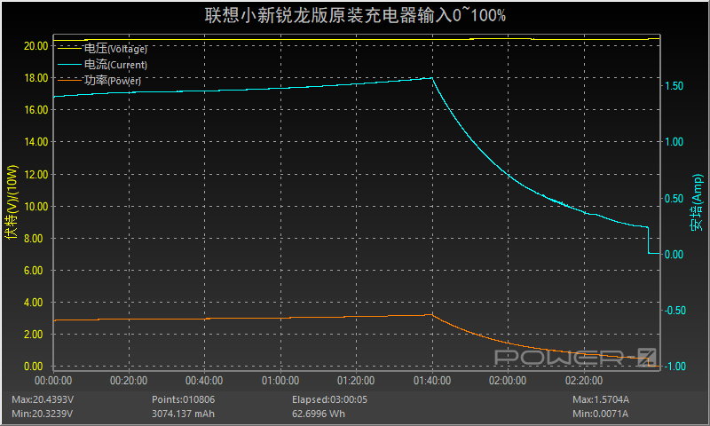 除了原装充电器外小编还使用其他两款充电器为笔电充电并采集充电全程的数据,2小时06分前功率、电流、电压均处于稳定的输入状态,功率在25W左右。随后功率和电流逐渐下降直至充电结束,全程耗时约2小时57分,最高功率为19.87V 1.29A 25.82W。