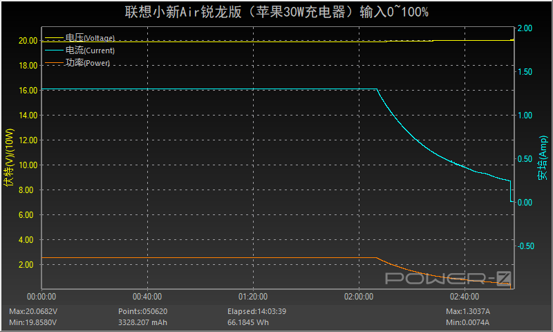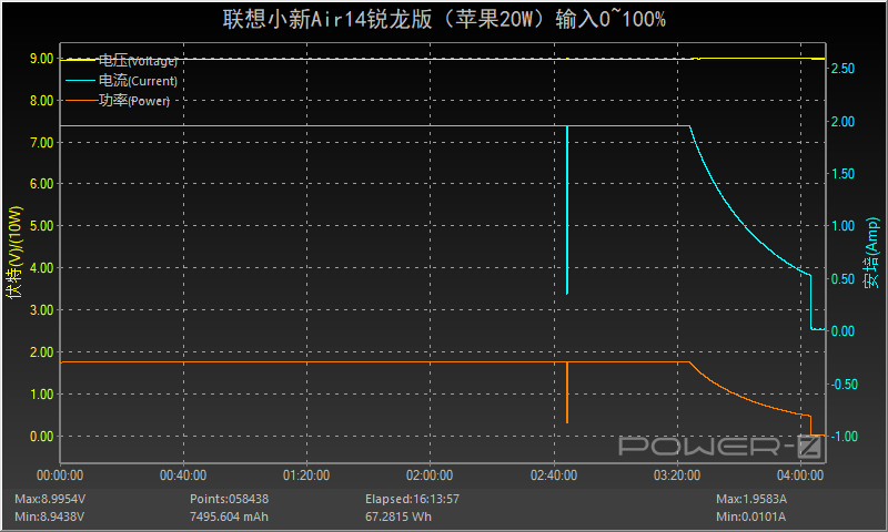 很多读者对于小功率的充电器能否为笔电充电存有疑问,所以此次小编还找来了苹果20W PD充电器为笔电充电,3小时24分前功率、电流电压均处于稳定的输入状态,功率在17W左右。随后功率和电流逐渐下降直至充电结束,全程耗时约4小时03分,最高功率为8.97V 1.95A 17.56W。