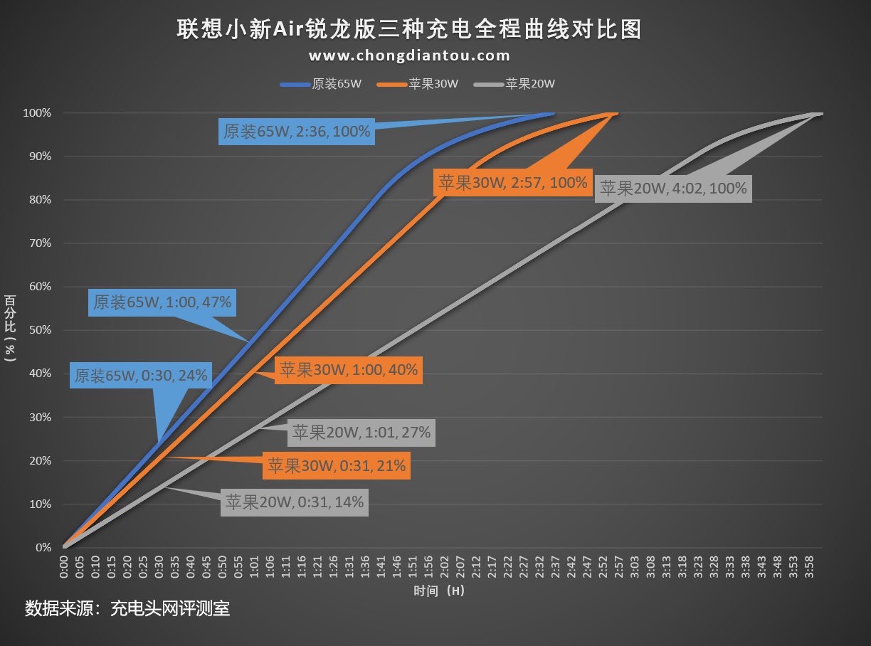 将三种充电全程绘制成曲线图,可以看出虽然前两个数据均处于30W功率阶段,原装65W充电器还是要比苹果30W充电器要快一些的。并且可以看出,苹果20W充电器是可以正常为笔电充电的,只不过受限于充电器自身功率只有17W左右,而且全程充满的时间也是最长的,达到了4个小时。