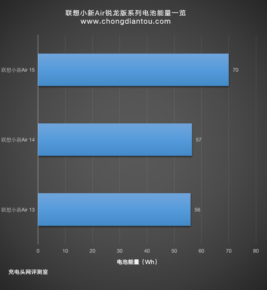除了对联想小新Air锐龙版笔电的充电进行测试之外,小编还查询汇总了一下相关数据。目前联想推出的AMD版本小新Air如果按照电池容量和功率区分的话共有三款,主要体现在屏幕大小上,而内置的电池能量也随着屏幕的变大而增加。
