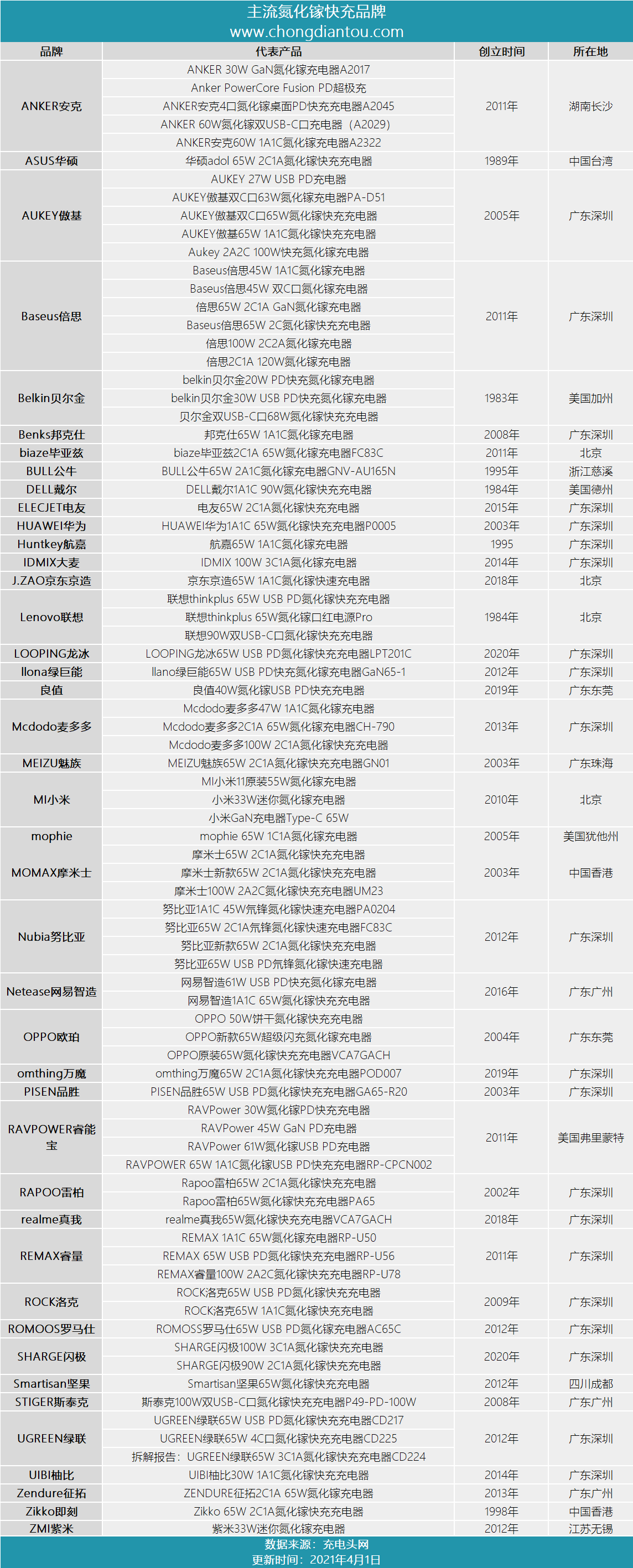 为了方便大家查阅,我们将大家耳熟能详的主流氮化镓快充品牌放入表格简单介绍,包括代表产品、创立时间以及所在地等重要信息,欢迎大家补充。