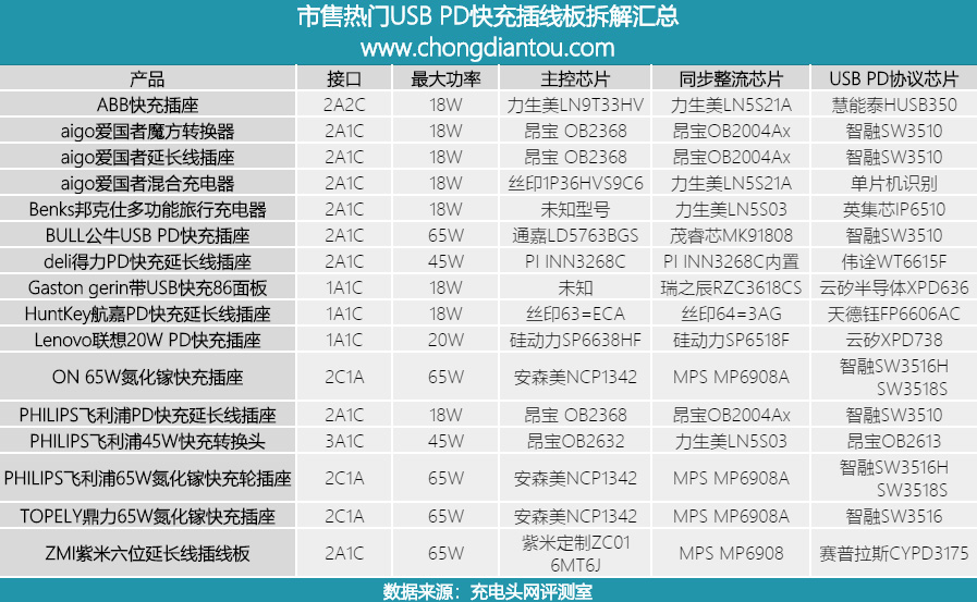 截止目前,充电头网已经累计拆解了16款USB PD快充插线板,产品形态各异,输出功率从18W到65W之间不等。下面就为大家分享这些主流的USB PD快充插线板都用了什么方案。