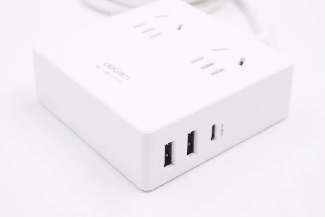 deli得力45W 2A1C PD快充插线板机身方形设计,配备两个新国标2+3组合插孔且带有安全门,可以避免异物插入造成触电危险。此外内置大功率USB输出模块,USB-C接口单独使用时支持45W输出,拥有5/9/12/15V3A和20V2.25A完整的PDO,并且还支持QC2.0/3.0、AFC、FCP、SCP快充协议。兼容协议多,档位齐全,能为市面上大部分数码设备提供快速充电。两个USB-A接口支持Apple 2.4A协议,对苹果设备较为友好。