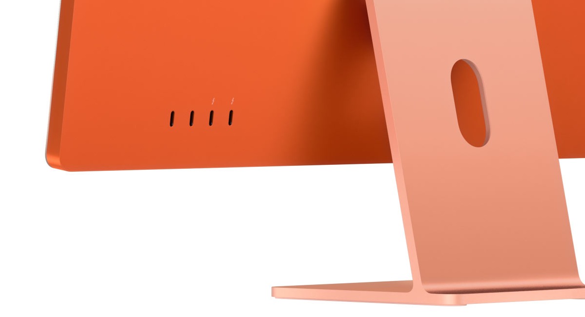 数据接口方面iMac采用了全USB-C物理接口设计,图中左边两个USB-C支持USB3.2 Gen2数据标准,最大传输速率10Gbps。右边两个USB-C基于USB4/雷电3标准开发,最大传输速率40Gbps。